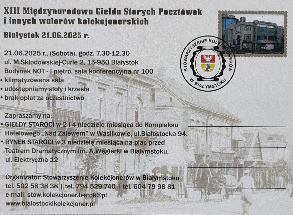3. XIV Międzynarodowa Giełda Starych Pocztówek i innych walorów kolekcjonerskich odbędzie się 20 czerwca 2026 roku, budynek NOT w Białymstoku ul. M. Skłodowskiej Curie 2