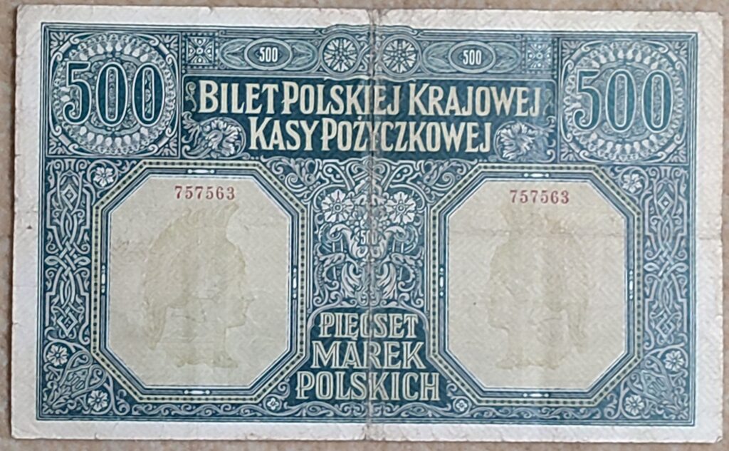 Bardzo rzadki banknot – 500 MAREK POLSKICH – Bilet Polskiej Krajowej Kasy Pożyczkowej, 1919 rok