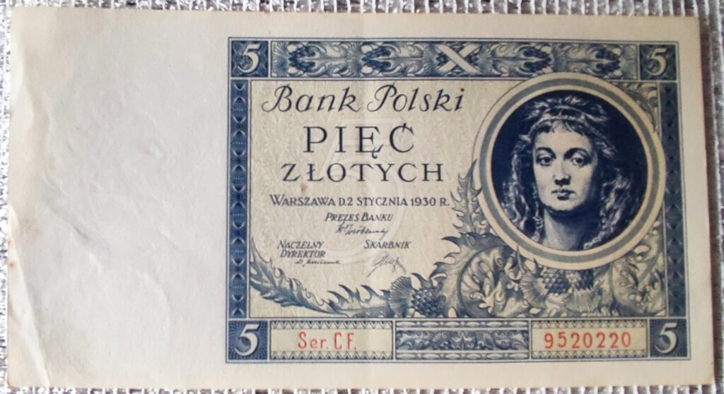Polski banknot PIĘĆ ZŁOTYCH z 1930 roku