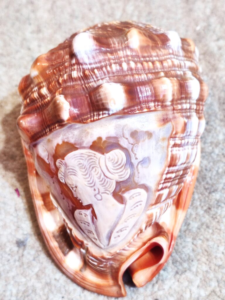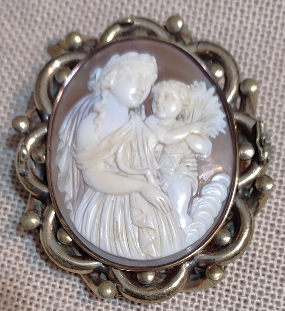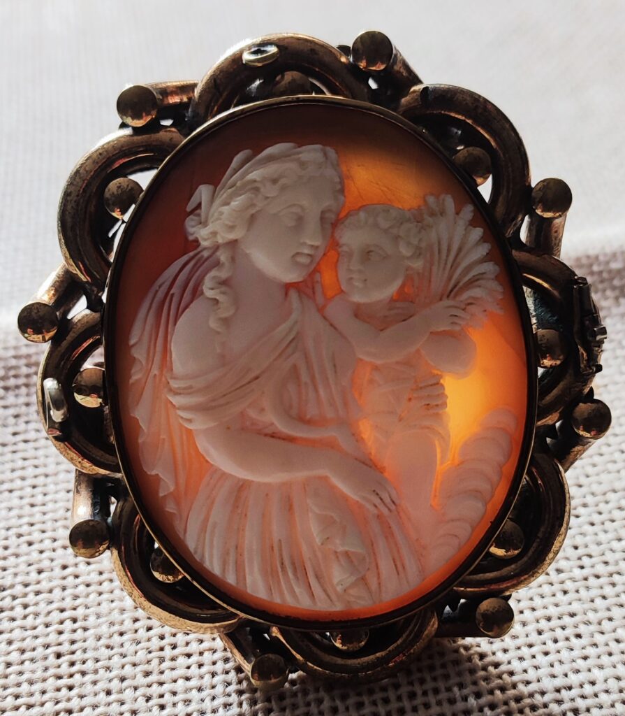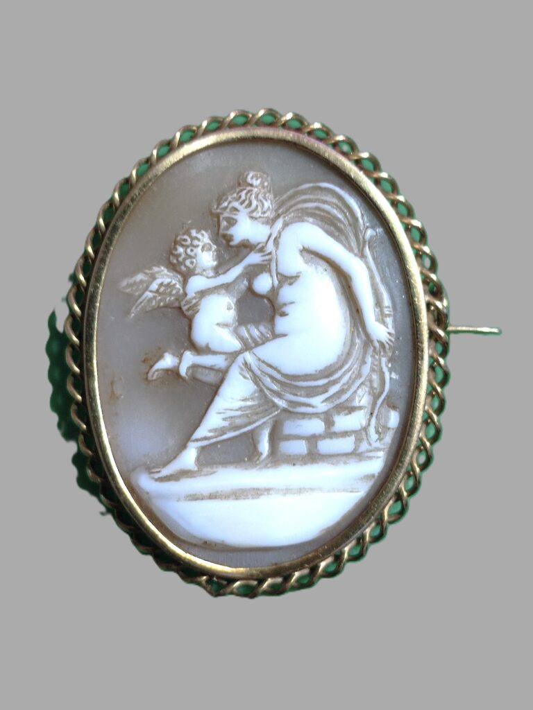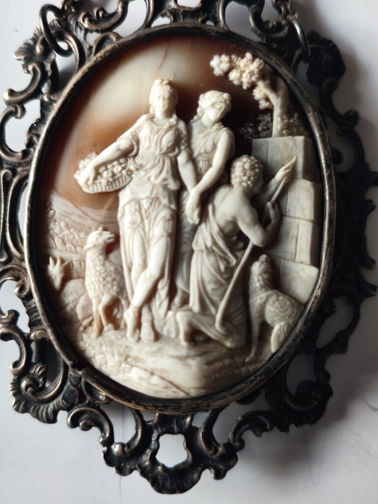 Kamea z XIX wieku – wykonana w muszli, oprawa- brąz pozłacany