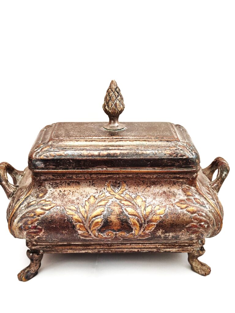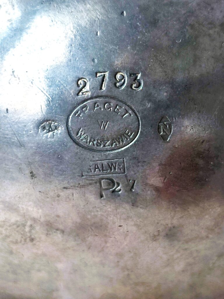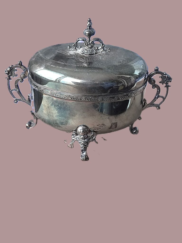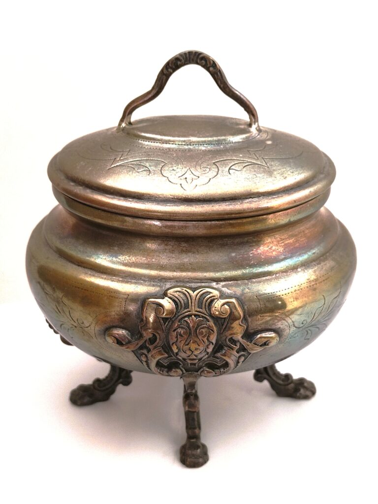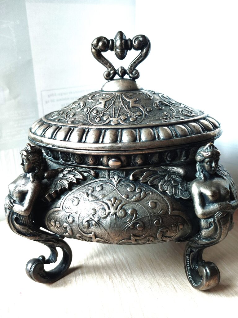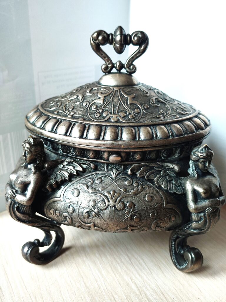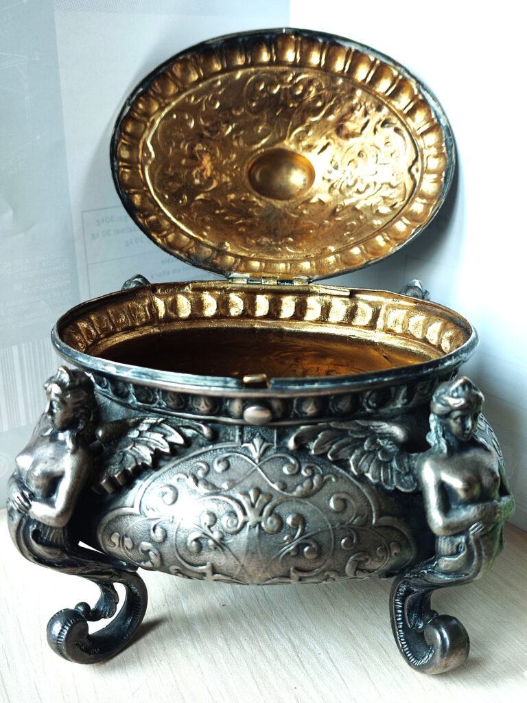 Szkatuła czy cukiernica? – piękny, platerowany, bardzo dekoracyjny przedmiot wykonany w znanej i cenionej firmie FRAGET w Warszawie, numerowany, z dodatkowymi oznaczeniami firmowymi. Doskonały stan zachowania, naturalna patyna, figuralne ozdoby – poświadczają renomę warszawskiej firmy FRAGET (od 1824 roku do wybuchu II wojny światowej)
