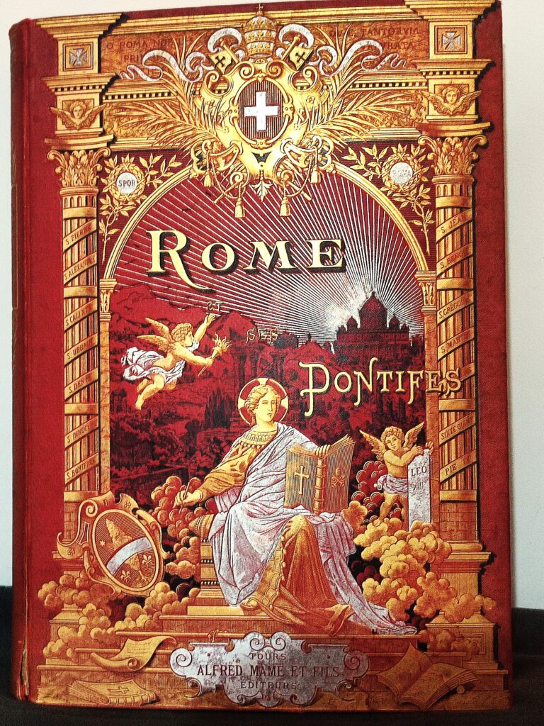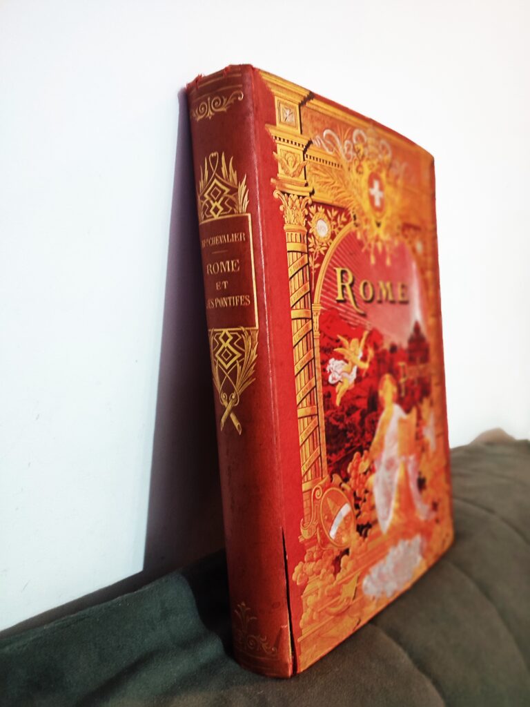 Piękna oprawa księgi z XIX wieku. Wydana w Tours (Francja) w 1896 roku, poświęcona historii, tradycji i budowlom Rzymu.