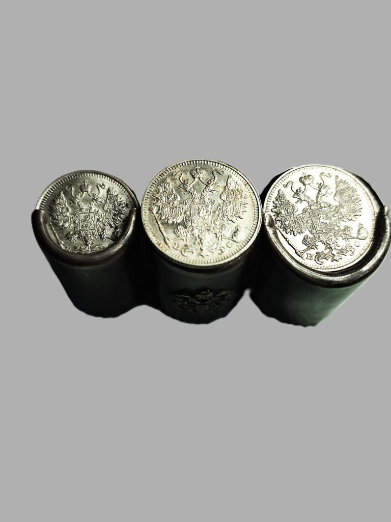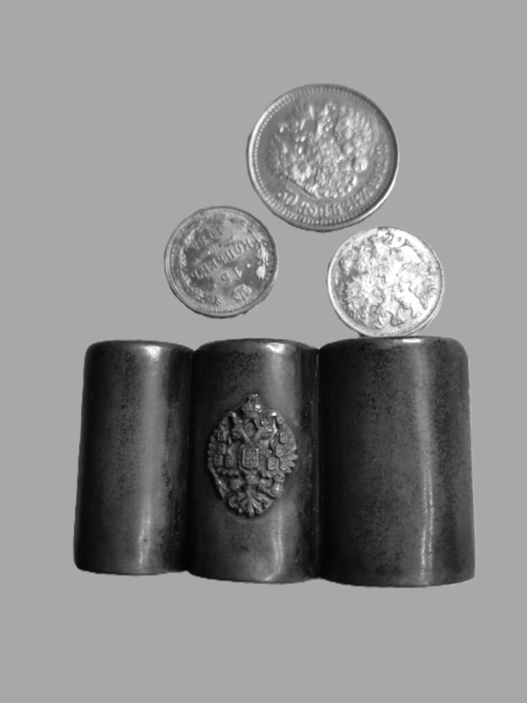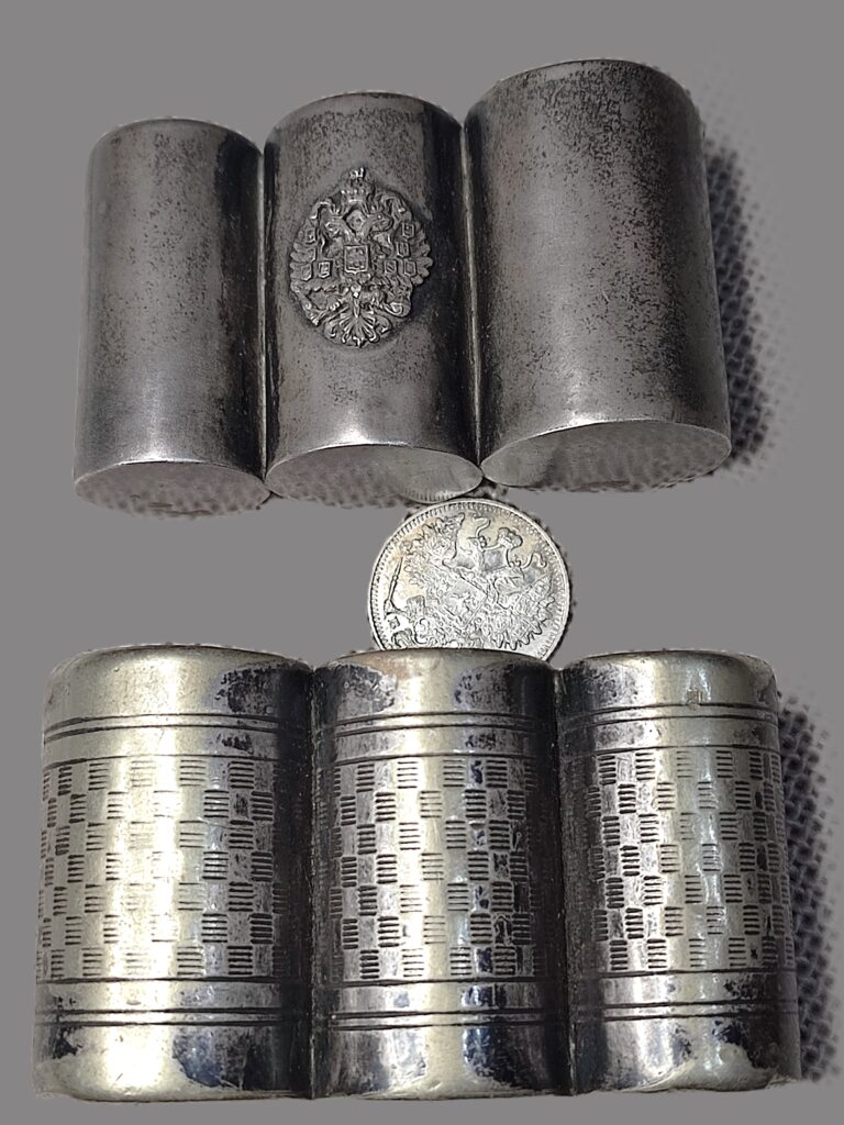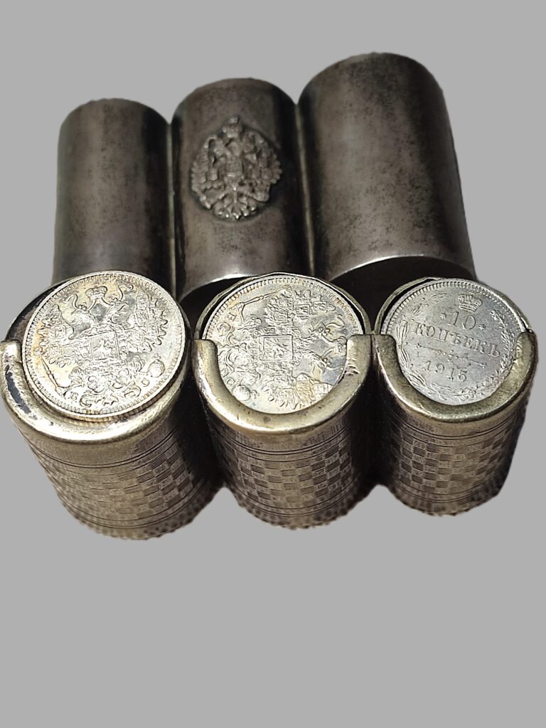 Pojemniki – etui na monety XIX lub początek XX wieku. Carska Rosja ( ciekawostka kolekcjonerska ). Podobne pojemniki powstawały także w znanej warszawskiej firmie Norblina